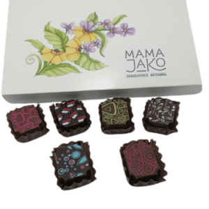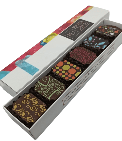 Caja con 6 barritas de 13 grs. serigrafiadas en 40,60 y 75% cacao formato 19 x 4.