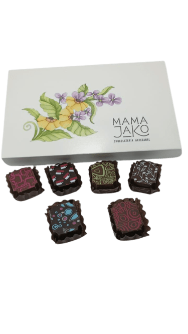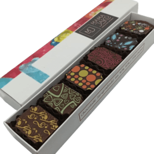 Caja con 18 barritas de 13 grs. serigrafiadas en 40,60, 75% cacao formato 12 x 19.