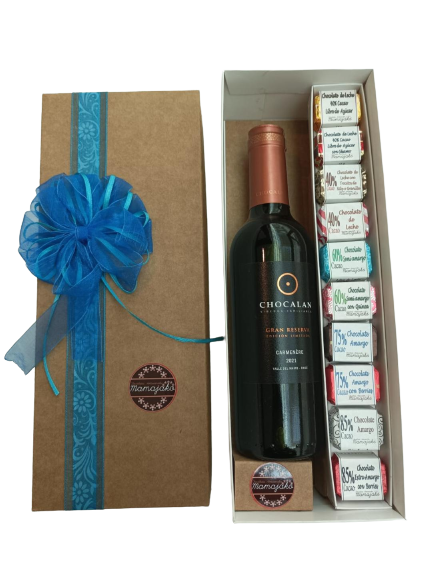 Caja con 10 barritas de 13 grs. en diferentes porcentajes de Cacao más un Vino Carmenere Gran Reserva Viña Chocalán tamaño 12 x 30