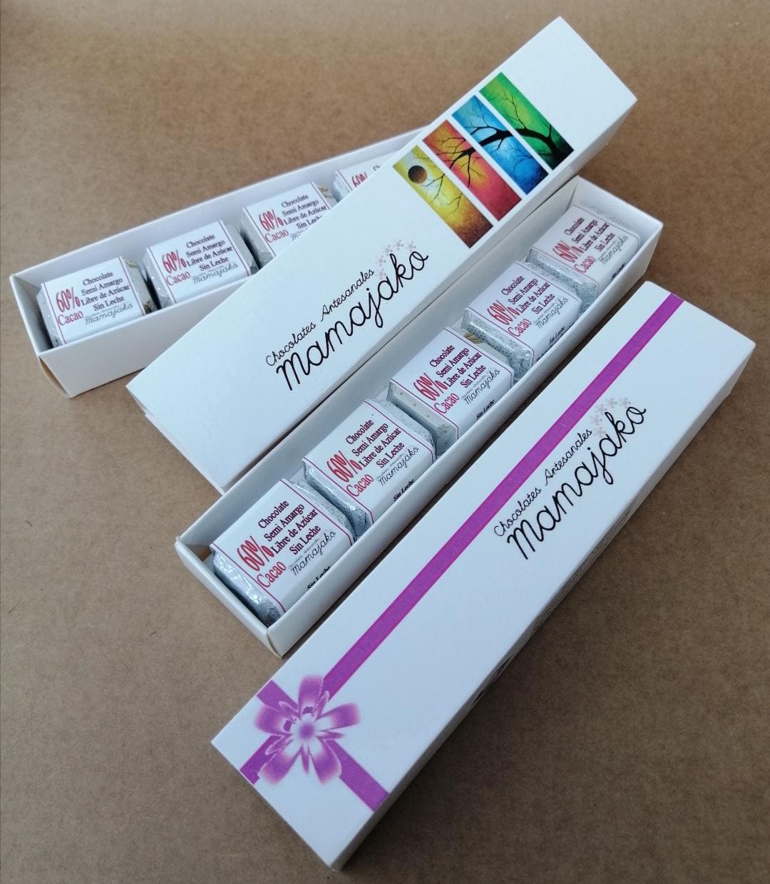 Caja con 5 barritas de 13 grs. en 60% cacao libre de azúcar y de leche formato 18 x 4.